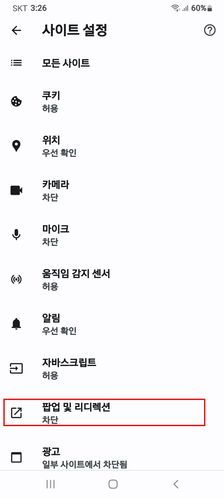 2. 안드로이드 휴대폰 크롬 팝업 차단 해제 및 허용