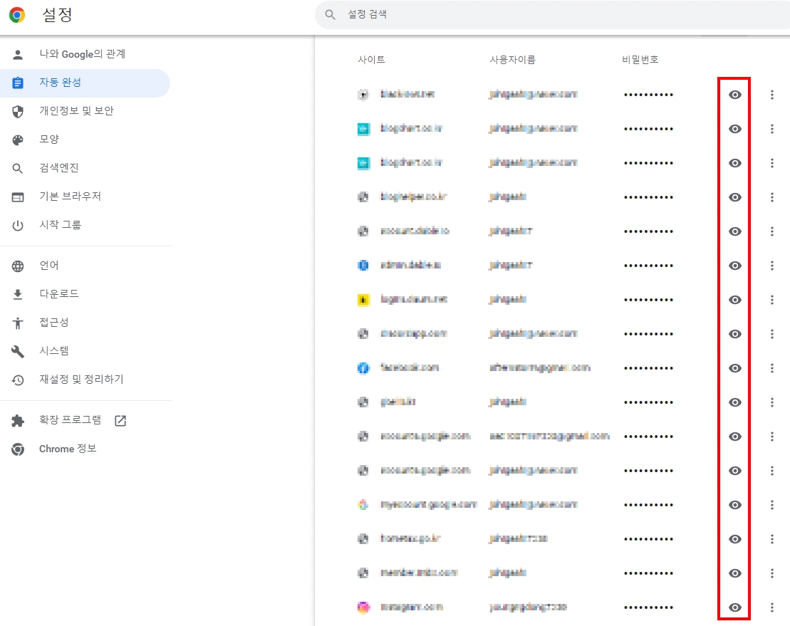 1. 사이트 아이디 비밀번호 확인. 간혹 내가 들어간 사이트의 비밀번호나 아이디가 생각나지 않을 경우 크롬 자동완성 기능을 이용해서 찾을 수 있습니다. 간단한 기능이지만 매번 자동으로 저장해놓고 쓰다가 막상 기억이 잘 안 날 때는 크롬 설정에서 찾으시면 훨씬 편합니다.