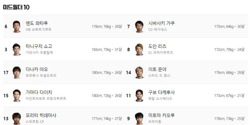 미드필더 엔도 와타루, 시바사키 가쿠, 타니구치 쇼고, 도안 리츠, 다나카 아오, 이토 준야, 가마다 다이치, 쿠보 다케우사, 모리타 히데마사, 미토마 카오루