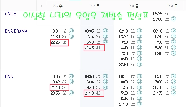 첫째, 이상한 변호사 우영우 방송시간은 수요일, 목요일 9시 10분이며 ENA 드라마 채널에서 본방송 이후 10시 25~30분에 바로 재방송을 합니다. 또 금, 토, 일 3일간은 전 방송 2회 차 연속으로 재방송을 하니 참고하시면 됩니다.