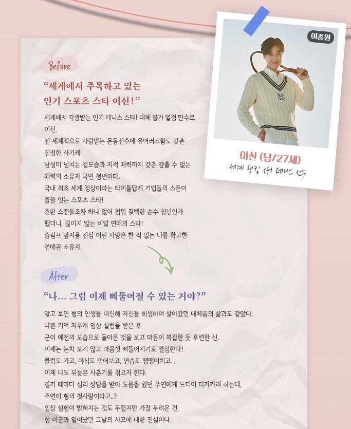 이종원은 김재웅의 잘나가는 동생으로 자신의 심리 상담을 해 준 주연에게 다가서려는 찰나 형의 첫사랑이라는 사실을 알게 되면서 형제 간의 삼각관계가 벌어진다고 합니다. 여담으로 제작발표회에서 비하인드 스토리를 공개했는데 김재중과 진세연의 키스신을 보고 진짜로 묘한 기분이었다고 합니다.