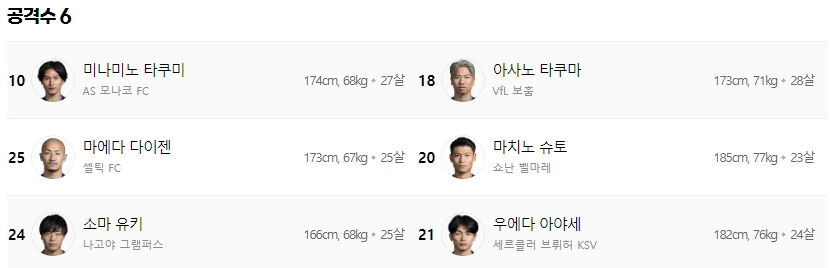 공격수 미나미노 타쿠미, 아사노 타쿠마, 마에다 다이젠, 마치노 슈토, 소마 유키, 우에다 아야세