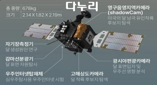 60년대보다 컴퓨터가 대폭 발달했음에도 다누리호가 4개월 여정이 걸리는 데에는 연료를 아끼기 위해서 BLT/WSB 방식으로 전이를 선택했기 때문이라고 합니다. 이렇게 힘든 여정을 선택한 것은 바로 새도캠 탑재를 위해서라고 합니다. 다누리호에 대해서 좀 더 자세히 알아보겠습니다.